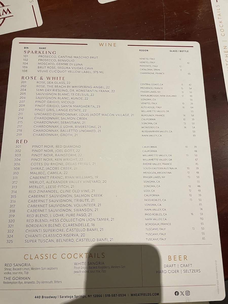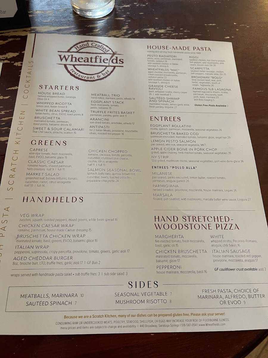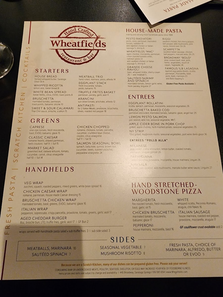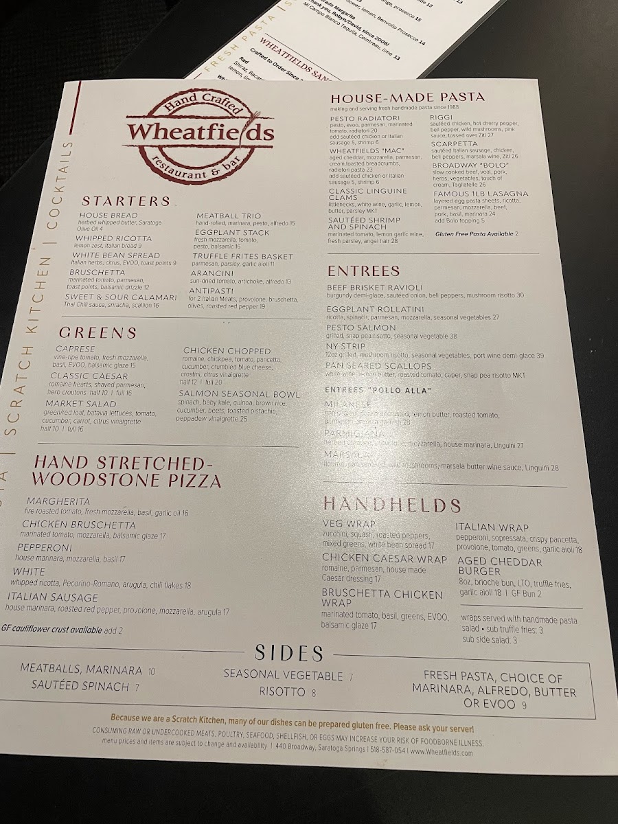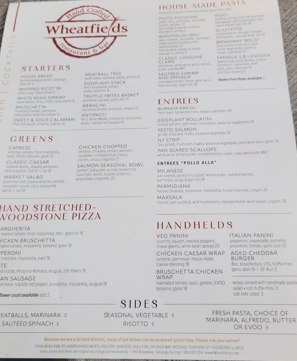 Right in the heart of Saratoga Springs at 440 Broadway, the Wheatfields Restaurant And Bar Menu feels like a love letter to classic Italian comfort with a polished, downtown vibe. The first thing I noticed was how effortlessly it balances hearty, familiar dishes with a few refined surprises. You’ll find rich pasta plates layered with slow-simmered sauces, crisp salads that don’t feel like an afterthought, and brick-oven pizzas that arrive with perfectly blistered crusts and generous toppings.